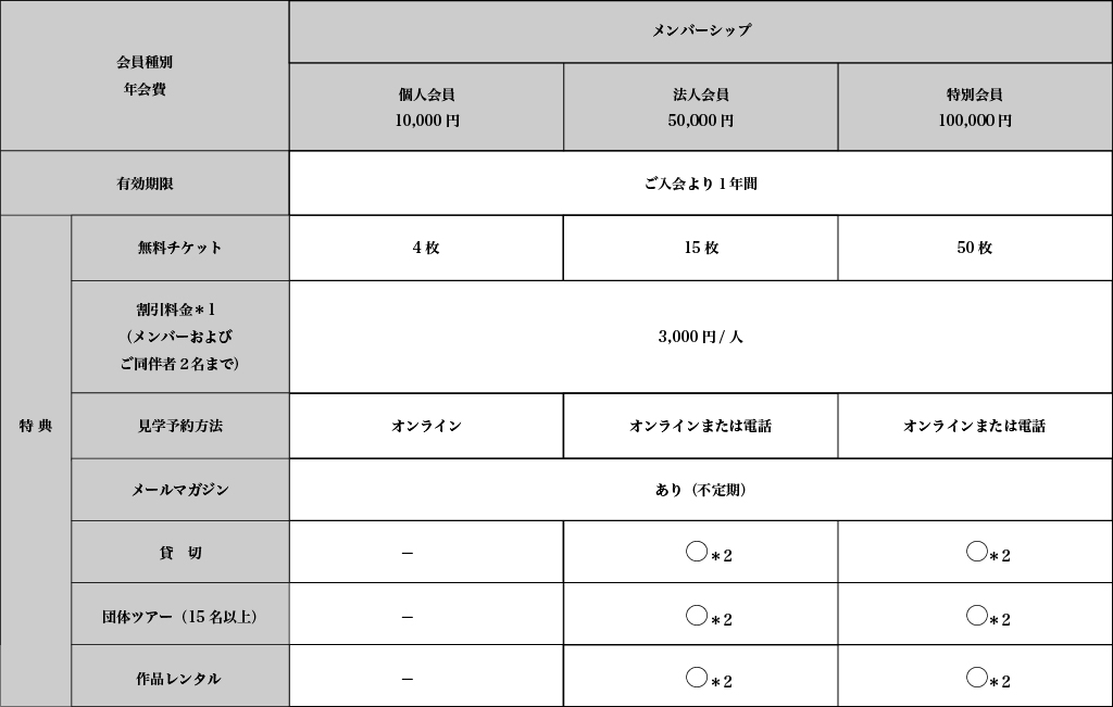 - メンバーとご同伴者2名様まで、割引価格(1名様3,000円)にて見学いただけます。